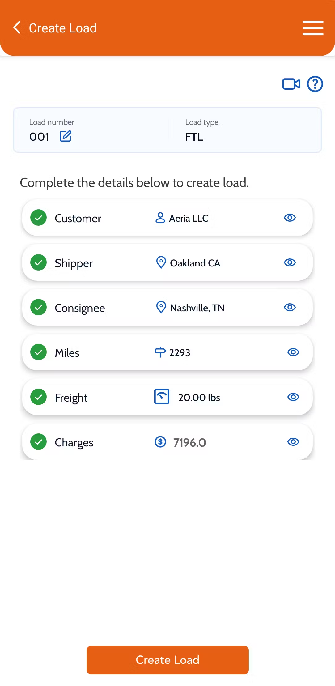 Once you complete all the steps, you can preview each information added by clicking the preview icon, and make any changes if required, or continue to complete creating load by clicking the “Create Load” button.